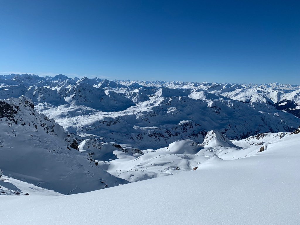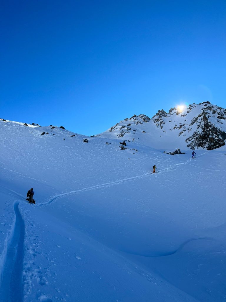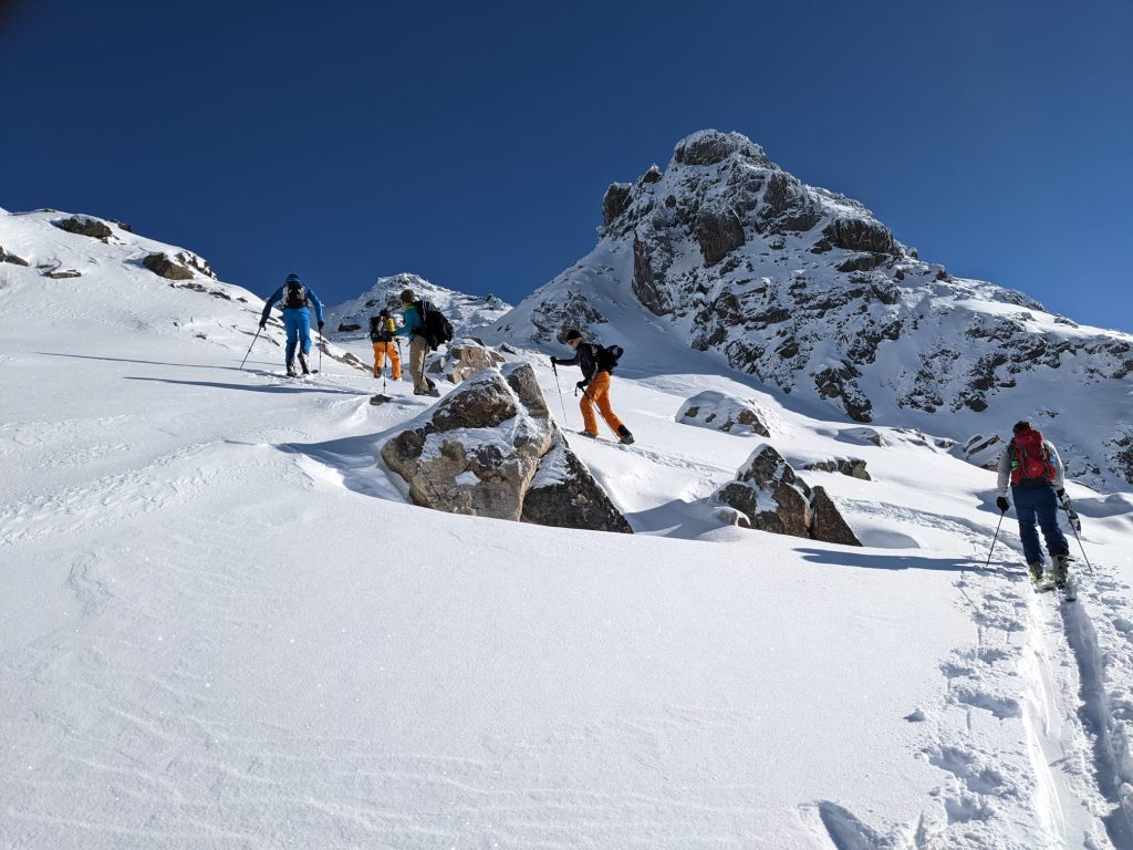 Nach dem abwechslungsreichen Aufstieg wird man mit einer wunderbaren Rundumsicht belohnt. Die Abfahrt erfolgt entlang der Aufstiegsspur zurück zum Tschuggen.